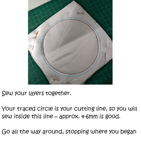- Sew your layers together. Your traced circle is your cutting line, so you will sew inside this line – approx. 4-6mm is good. Go slowly until you get used to sewing in a circle. Stop with your needle down and adjust your piece as necessary. Go all the way around, stopping where you began. You can sew this by hand if you wish.