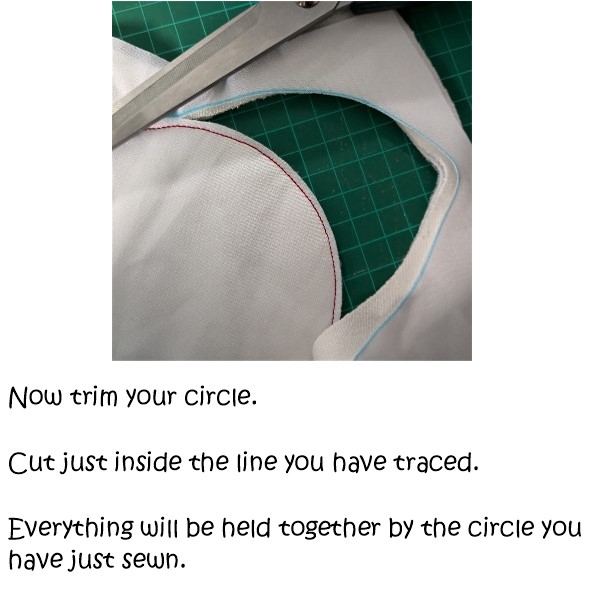 - Now trim your circle. Cut just inside the line you have traced, everything will be held together by the circle you have just sewn